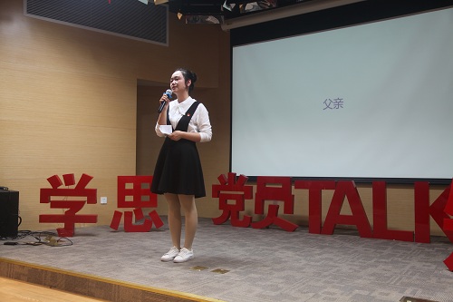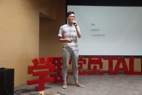 接下来进行分享的研究生党支部支书何俊利同学从“党员=X+Y+Z”的数学方程式讲起,讲述了自己与三位领路人的故事,从三个方面讲述合格党员应该具备的品质:拥护党的领导、领悟党的精神、跟随党的脚步。最后何俊利同学结合自己的本科经历激励大一新生去追求卓越,希望他们也能书写出自己的党员故事。