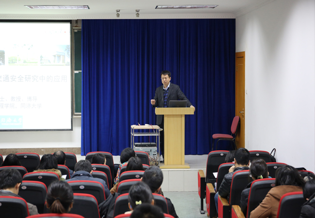 接着,王雪松教授做了题为《统计分析方法在交通安全研究中的应用》的报告。王教授介绍了交通安全研究的特点,涉及到人、车、路,因此需结合三个方面综合考虑,通过安全建模与设施的分解与积聚揭示事故偶然中的必然性。整个报告从交通安全事故数据分析、设施交通安全、车辆主动安全、交通行为分析、交通安全规划等多个角度阐述交通安全理论研究,分析了安全可提高黑点判别,信控交叉口的数据采集与处理,空间关联的安全分析模型,主干道安全评估方法,基于决策树的疲劳等级预测模型,ordered Logit模型等。最后介绍上海市道路交通安全的研究与应用及项目进展情况,数理统计在交通安全研究中的应用,探讨了可行的跨学科合作方向,表达了与数学系师生合作的强烈意愿。