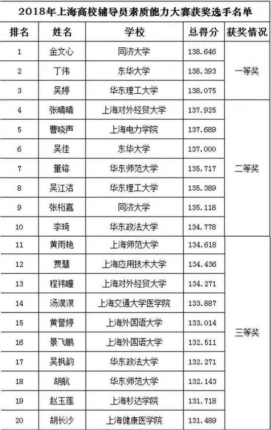 由中共上海市教育卫生工作委员会、上海市教育委员会主办,东华大学承办的2018年上海高校辅导员素质能力大赛于2018年11月28日圆满结束,本次大赛共有来自上海的51所高校、100名选手参加比赛。经过紧张激烈的角逐,我院辅导员金文心以总分第一荣获一等奖,交通运输工程学院辅导员张桁嘉获得二等奖。