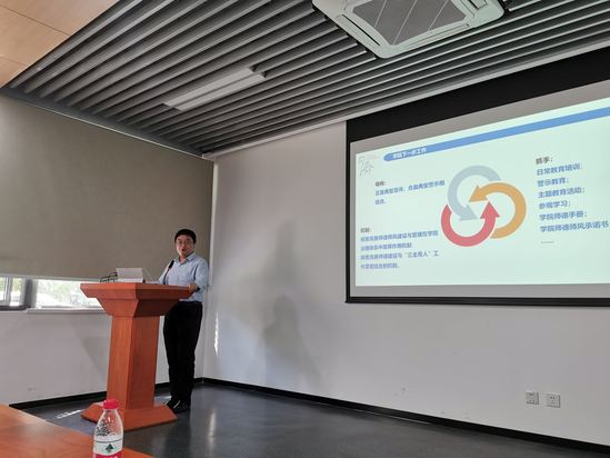 学院副院长潘生亮从教学工作的角度指出师德师风建设的必要性和紧迫性,对于“较常见”和“易忽视”的教改、科研项目经费使用领域存在的问题做了重要的提醒。学院党委书记孔德懿以“继承师德传统,培育优良师风,推进一流学科建设”为题,就师德师风教育宣讲谈了几点感想,进一步阐述了立德树人这个根本任务在人才培养过程中的主导性地位,并对学院下一步探索师德师风建设的具体工作做了介绍。
