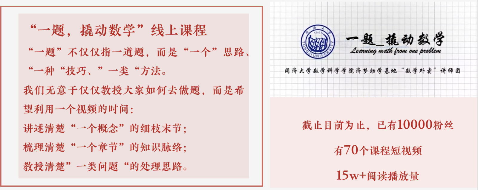 给你“一题”,一起来撬动数学?bilibili上线一个月,关注超10000人、视频播放量超150000次、分享514次、收藏6888次、评论1277条、点赞3904个。“反响这么好,我自己也没想到”,“一题”发起人兼up主李瑞笑着挠了挠头。考虑到时间和场地的局限性,线下课程难以满足所有同学的需求,“数学外卖”团队便萌生了做网络课程的想法,在彭婧老师的鼓励下,2017级统计学专业的李瑞利用大二暑假空闲时间,尝试着做了几个数学教学视频放到bilibili上,“一题”由此诞生。用他的话来说:“‘一题’不仅仅是一道题,更是一种思路、一种技巧、一类方法,我们期待用线上视频打破门槛,让数学学习变得更轻松、便捷,进而帮助到更多的人。”