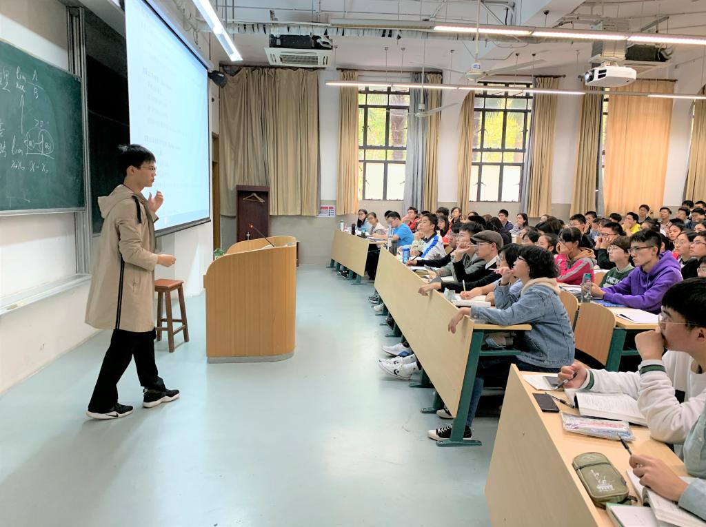 “吃在同济”说的不一定是食堂里的饭菜,也可能是校园里输送着的某种精神食粮,譬如“数学外卖”。这不,距离上课还有十多分钟,能容纳200人的阶梯教室里已经坐满了赶来“加餐”的同学,有些同学来晚了,那就站着听完全程。一个半小时的讲座,a漫