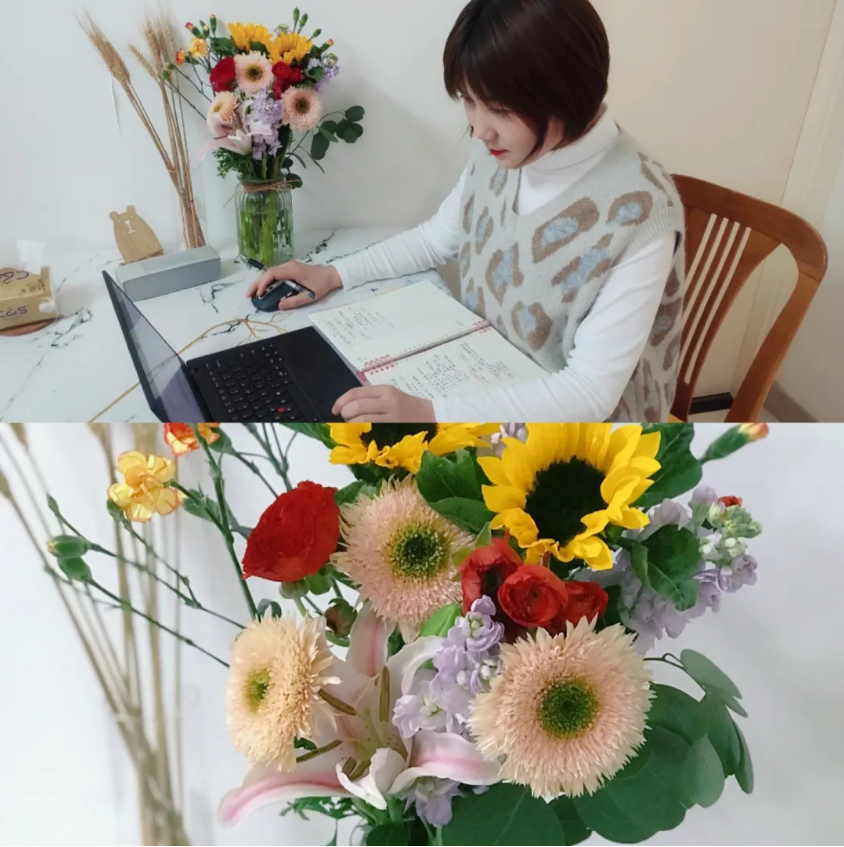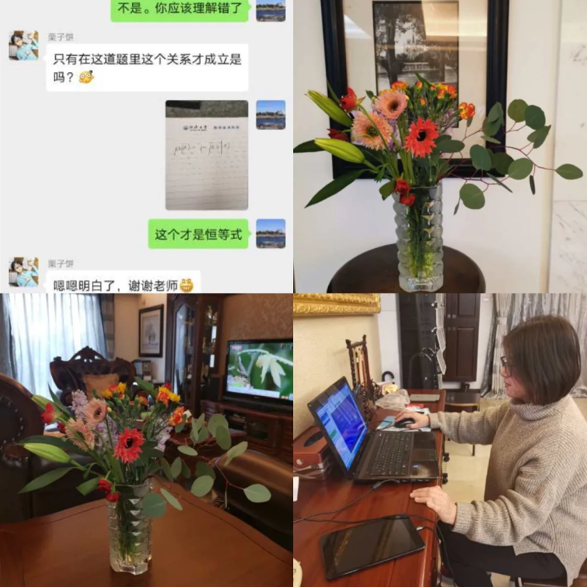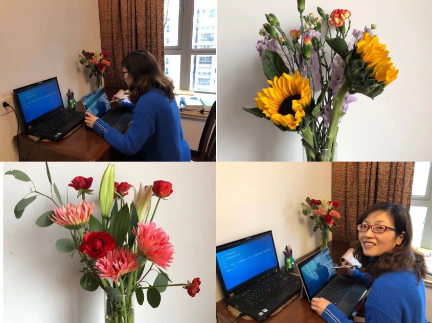 非常感谢组织者的用心和贴心!在这段自我隔离的日子里,收到鲜花真是一件令人欣喜的事,让姐妹们足不出户也能感受到春天的气息,度过一个特别又温暖的节日。宅家的日子过得有些单调,每天做饭备课,比较枯燥。好在网课是一个全新的体验,通过网络,我们和分散在全国各地的学生汇聚在一起。虽然大家相隔千万里,但是在视频直播课堂,大家就如同面对面一般,能够方便及时的进行讨论交流,比起平时上课反而感觉与学生更接近。所以上网课成了我每天最开心的时间,尤其是还有鲜花在旁,赏心悦目,即使对着电脑讲课心情也是格外的好。