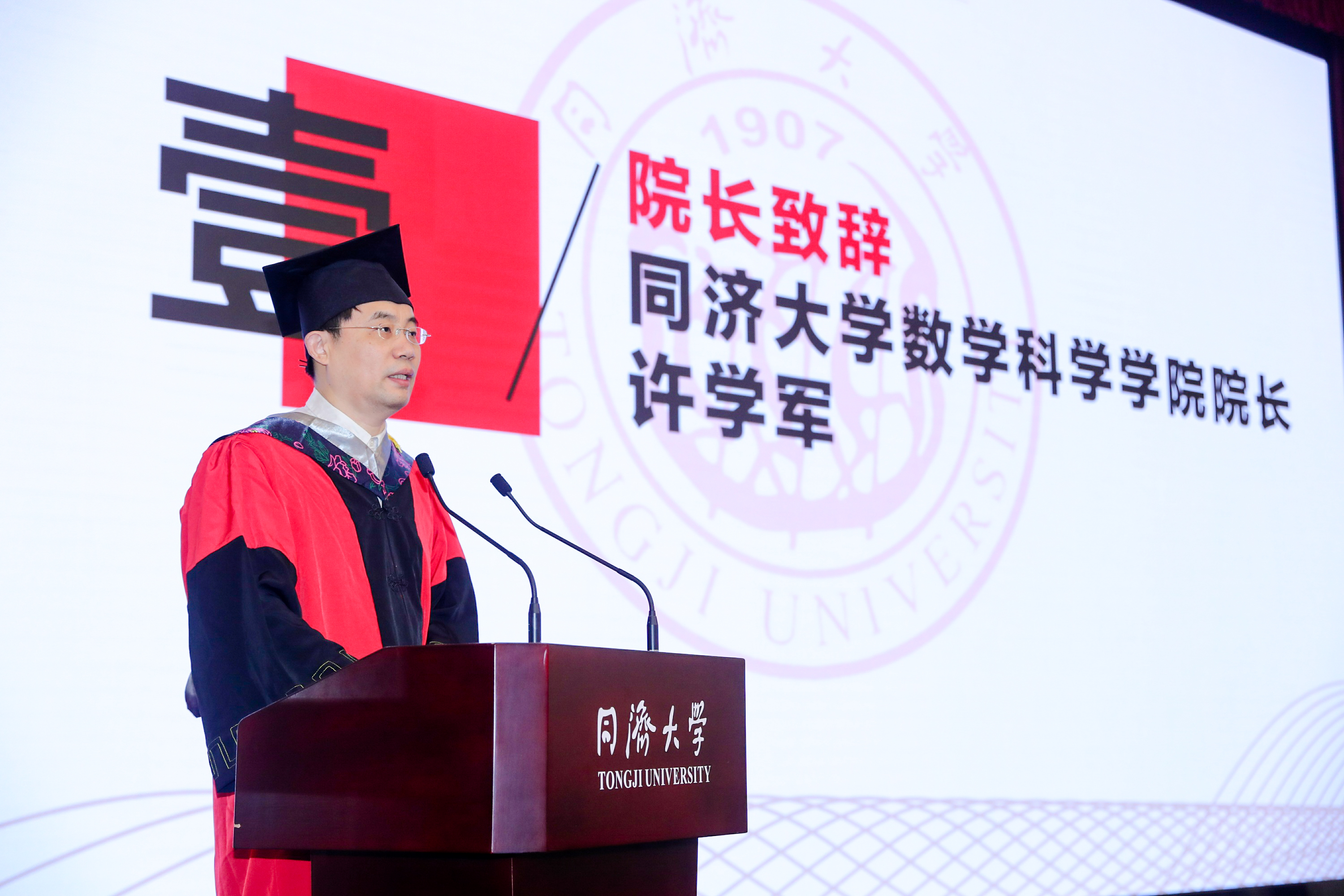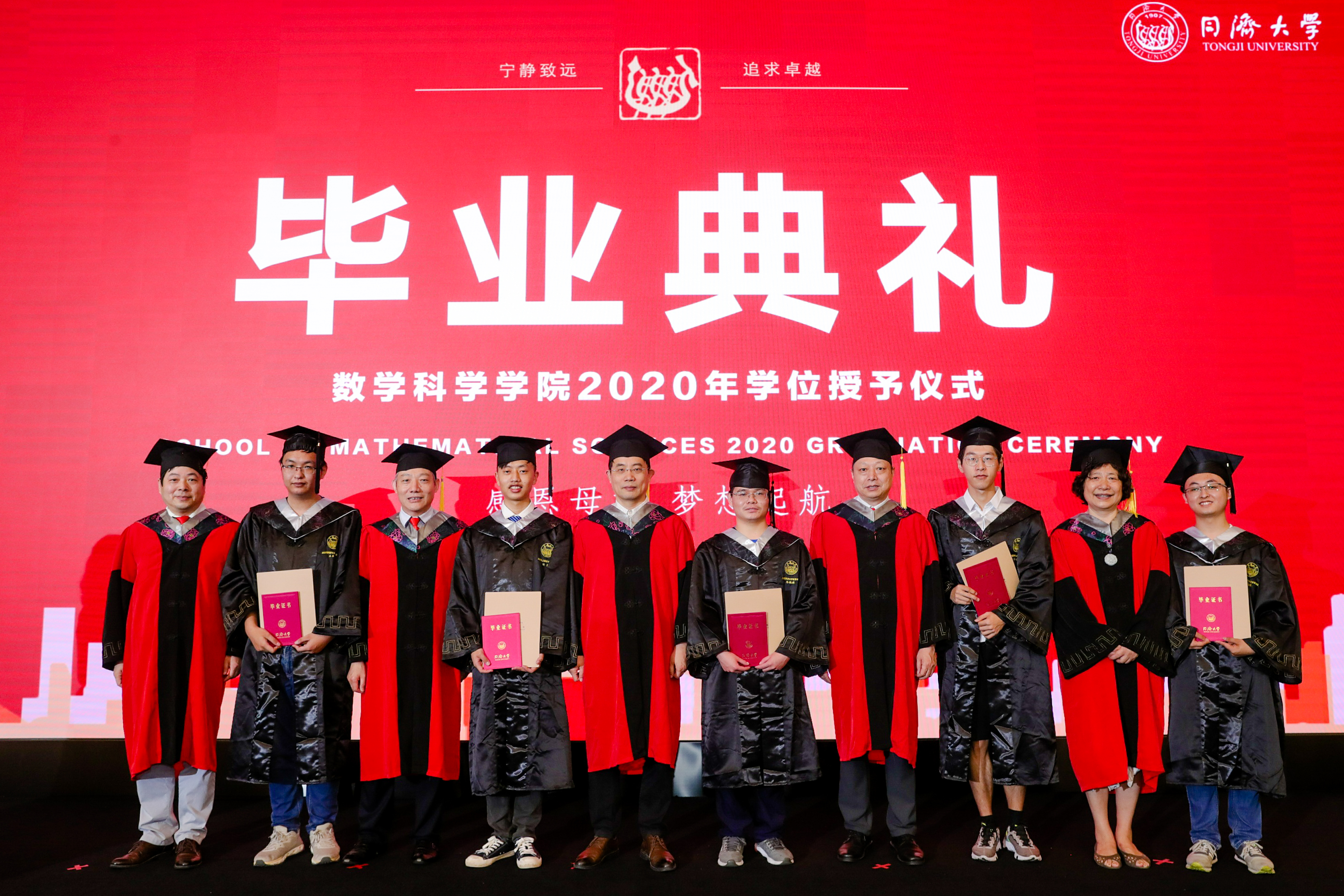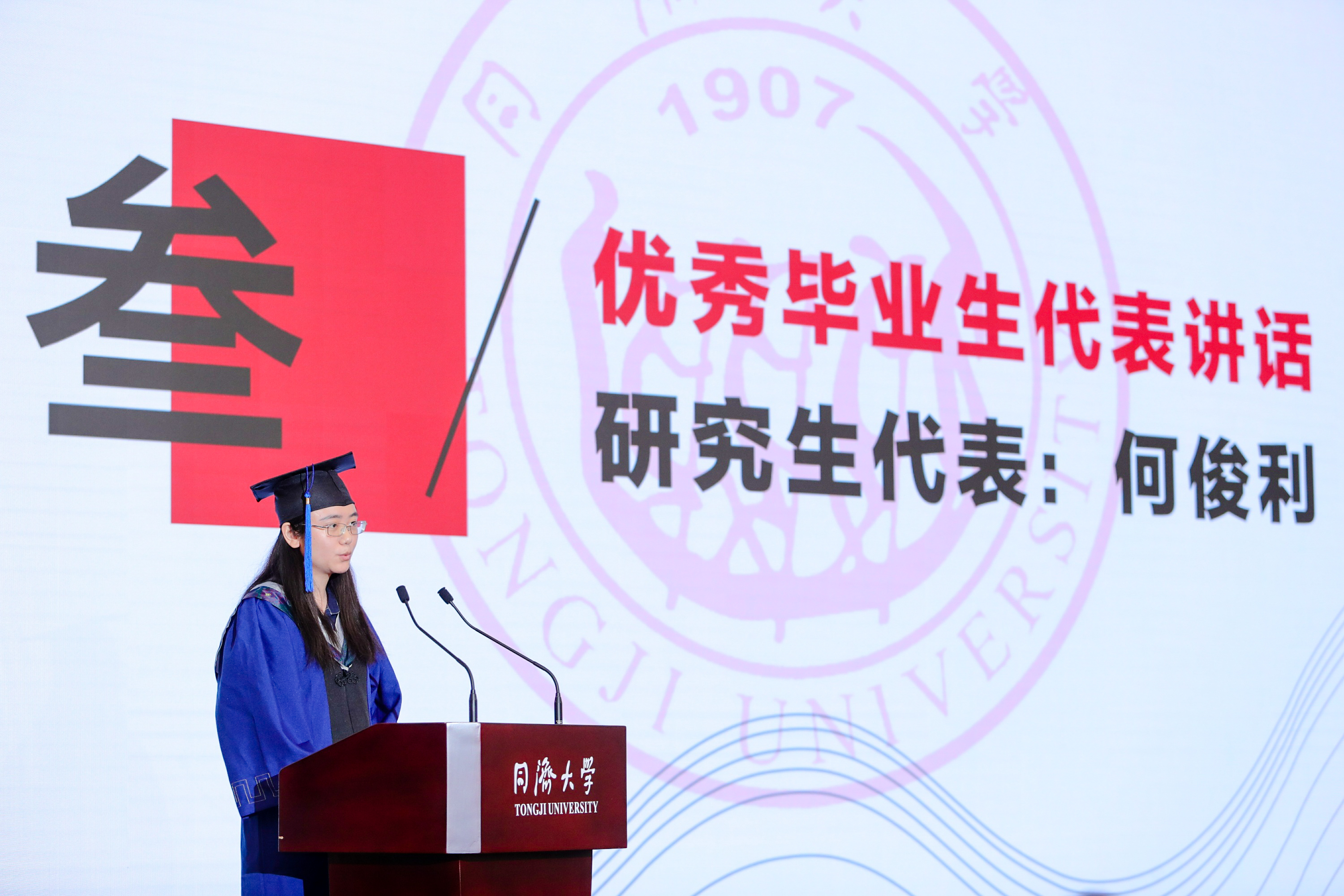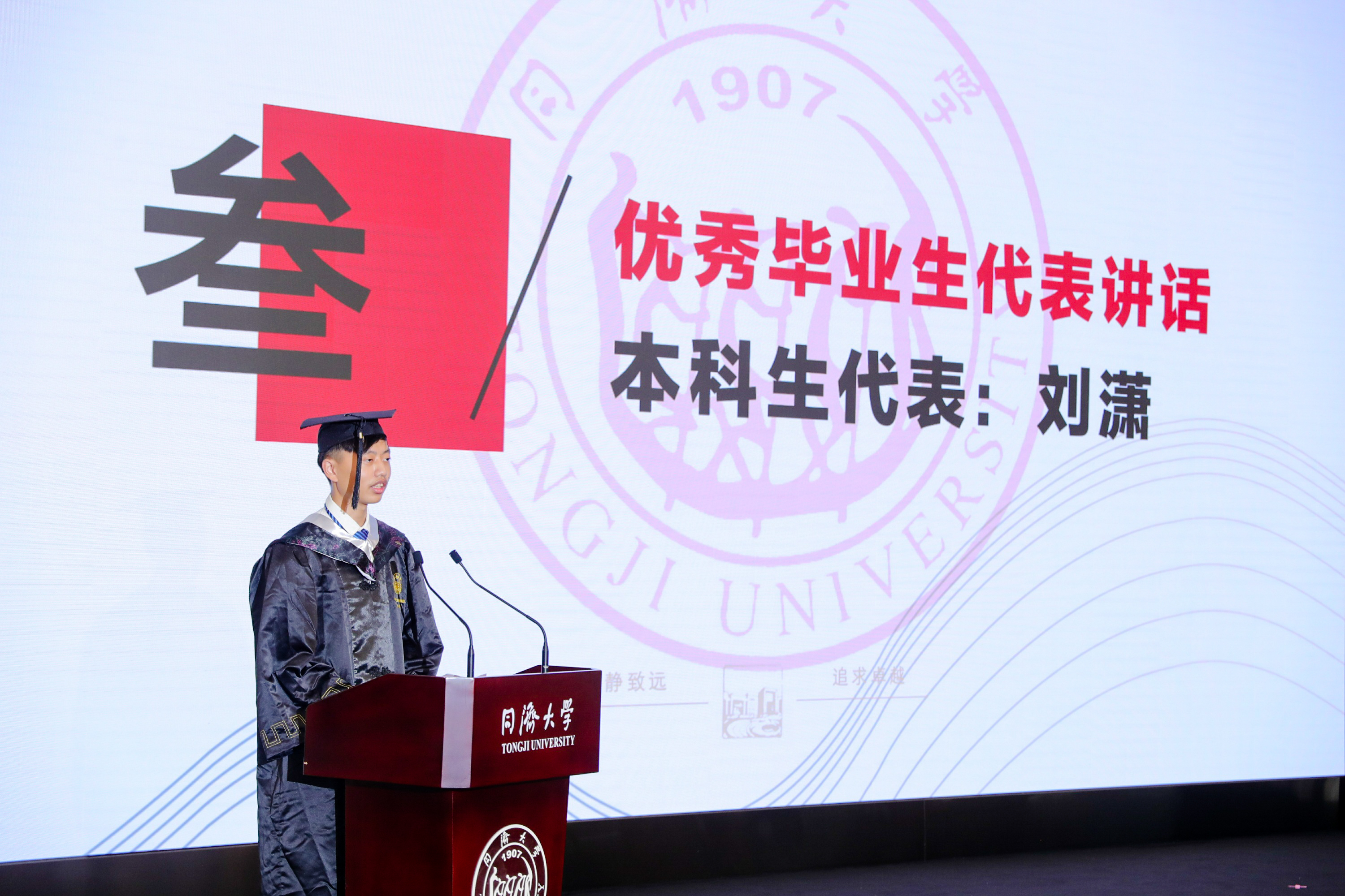 上海市优秀毕业生刘潇和何俊利作为毕业生代表上台发言。本科生代表刘潇同学回顾了自己四年的学习生涯,留下了点点滴滴难忘的回忆,谈到了对数学人的理解——在任何领域和行业都要以宁静之心,达致远之志。研究生代表何俊利同学讲述了自己在同济一路走来的成长和蜕变,她讲道,“奋斗是青春最亮丽的底色”,无论遇到怎样的困难,都不能轻易退缩,一定能书写出属于自己的答卷。