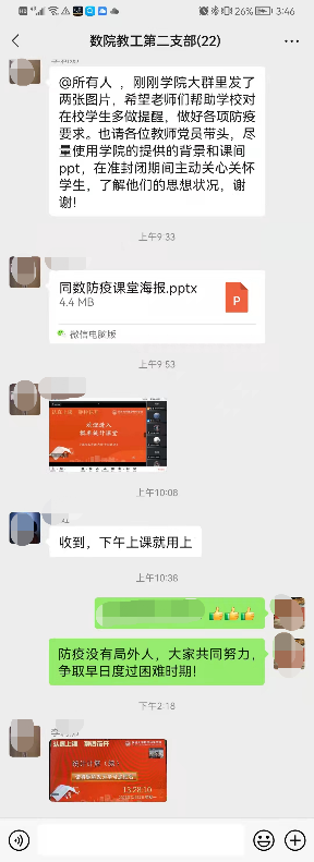 全体教师党员还主动在线上课堂给同学们“加点免疫餐”,使用统一的“防疫主题”背景幕布上课,课前用1分钟的小视频宣传防疫小常识,提醒同学们“三件套、五还要”,做好日常的健康防护……积极配合学校疫情防控的“大任务”,把防疫宣传的点点滴滴贯穿课上课下。