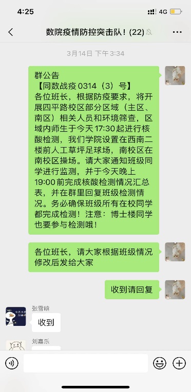 第一时间吹响学生骨干集结号,学院召集本研各班级班委入群,组建了22人的“数院防控突击队”,召集学生支部全体党员组建“数院党员先锋队”,厘清责任清单、划分任务片区,制定了任务明确、指令清晰的工作路线图,防控动态的班级公告栏、核酸检测的定制式提醒、自我防护的日常小贴士、积极抗疫的正能量推文,通过他们的手指快速点触,把朋辈的力量传递到每个数学学子的眼前。