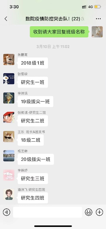 分散在四平、彰武、铁岭、南校区四处近500名数学学子,是学院疫情防控大考中的生力军,更是一群需要被呵护被关怀的孩子。学院三名辅导员校内校外协作、线上线下配合,将各项工作推置“第一时间”密集开展。