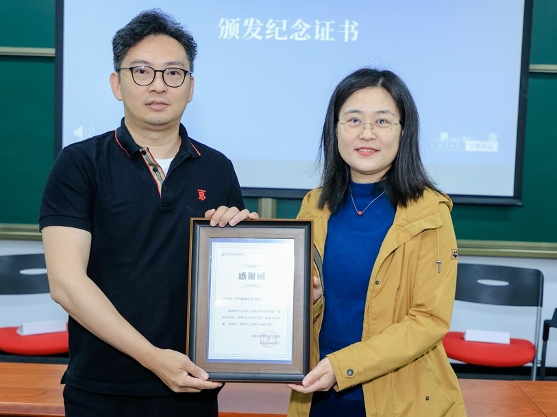 随后,学院党委书记李静茹老师为校友代表1999级统计学班长邢志刚学长颁发纪念证书,感谢校友对学院人才培养工作的支持。