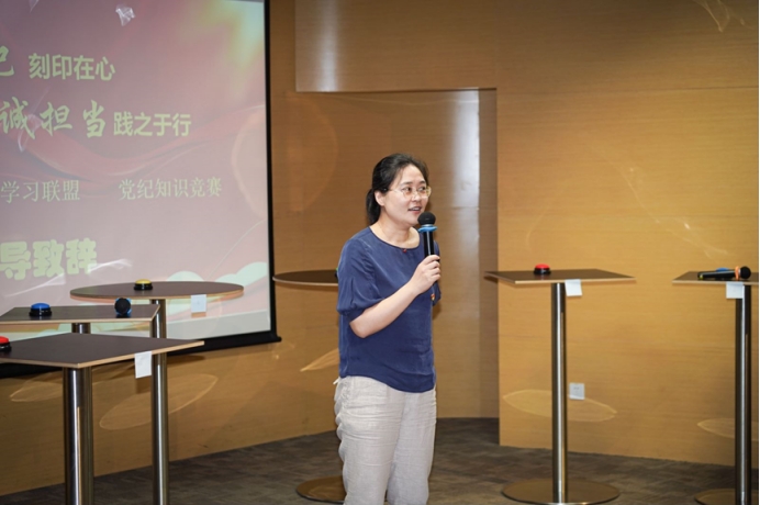 王小莉老师为比赛做动员讲话。王老师阐述了党纪学习教育的背景与意义,鼓励同志们深学细悟,以案示警,严格要求,严抓落实,自觉将一言一行主动对标党纪要求。并以本次知识竞赛为契机,进一步将党纪要求内化于心,外化于行。