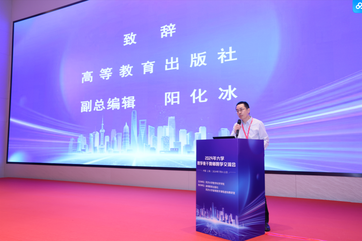 阳化冰代表高等教育出版社致辞。他表示,大学数学教育在高校人才培养体系中占据重要地位、发挥重要作用,我国高校在大学数学课程教材建设上具有优良传统,经过几十年的努力,推出了以同济版大学数学教材为代表的一大批优秀教材,已经成为中国高等教育教学改革、课程教材建设的典范和标杆,为各个时期高层次人才培养作出了突出贡献。当前,国内众多高校正在加快大学数学教学改革的步伐,同时更加关注新时代人才培养中数学教育的新要求,以及大学数学教学和教材建设中数字化、智能化的新浪潮。希望通过本次会议,加强交流、集思广益,探讨如何以人工智能赋能大学数学公共基础课程的教学内容、教学方法和教学模式改革,为推动技术创新、引领教育变革作出新的贡献。