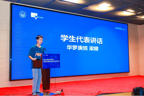 来自四川的梁键同学作为学生代表发言。他表示加入华罗庚班是荣誉也是责任,定当传承华罗庚先生的志向,学习先生勤奋钻研的精神,追求学术深度和人文素养,勇于创新,勇攀高峰,将个人梦融入中国梦。