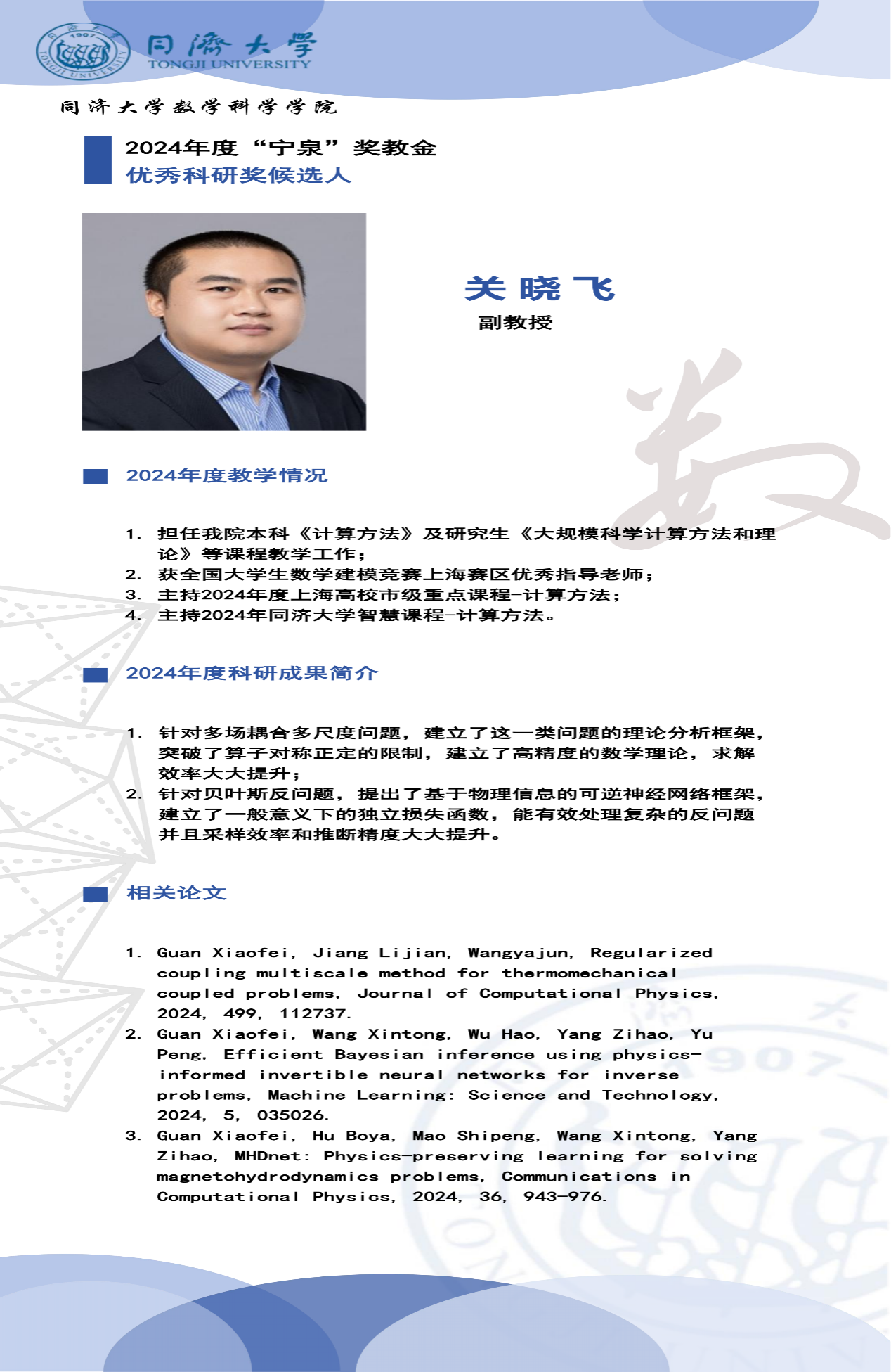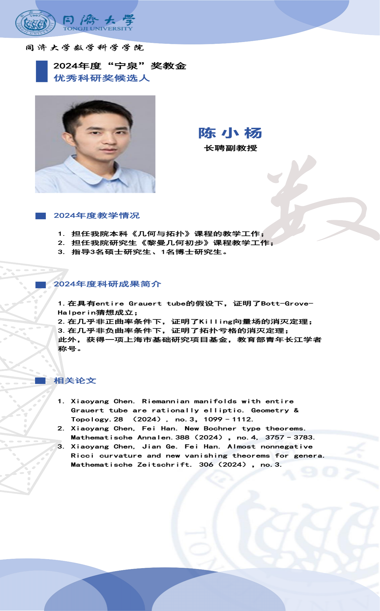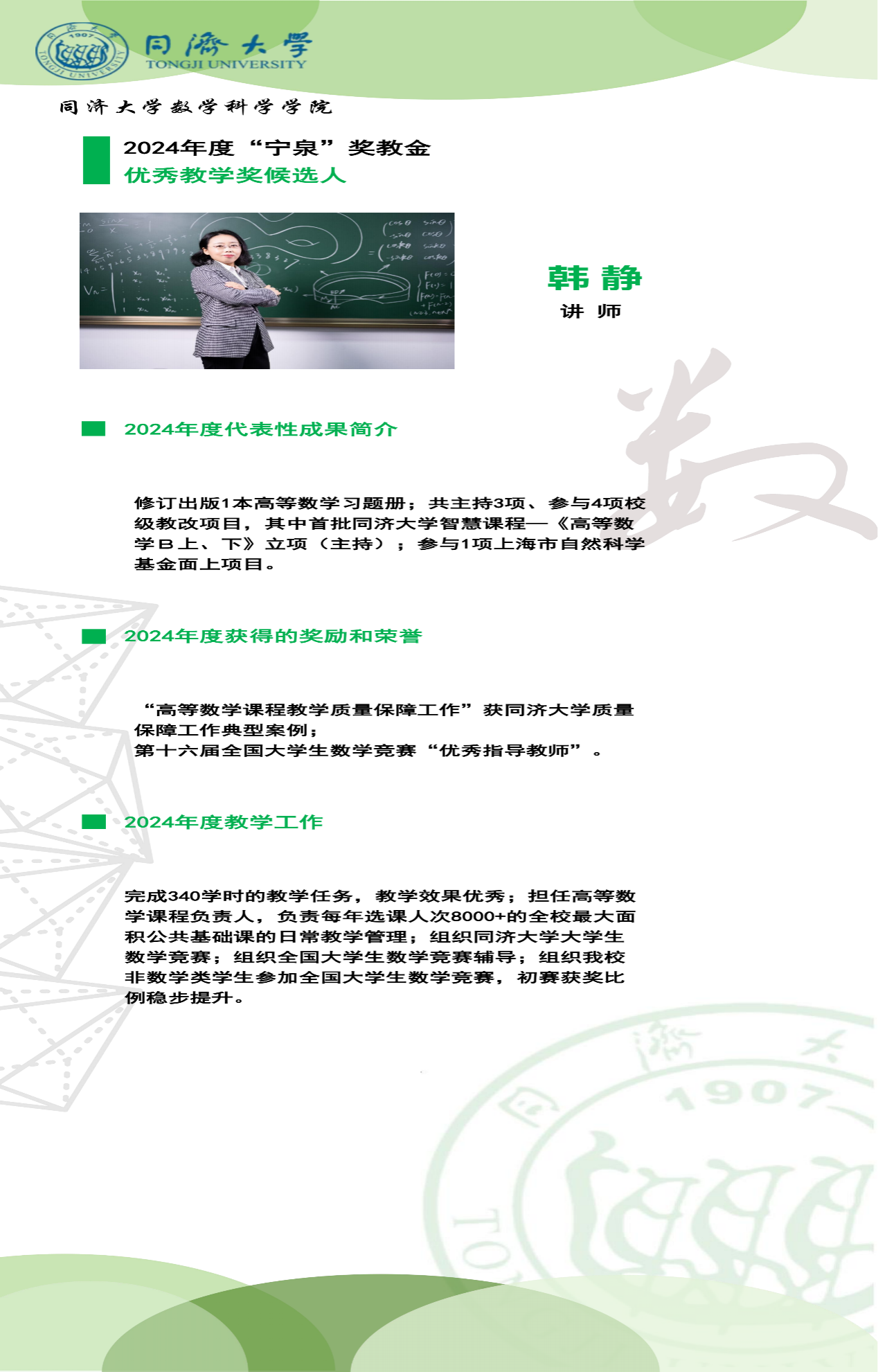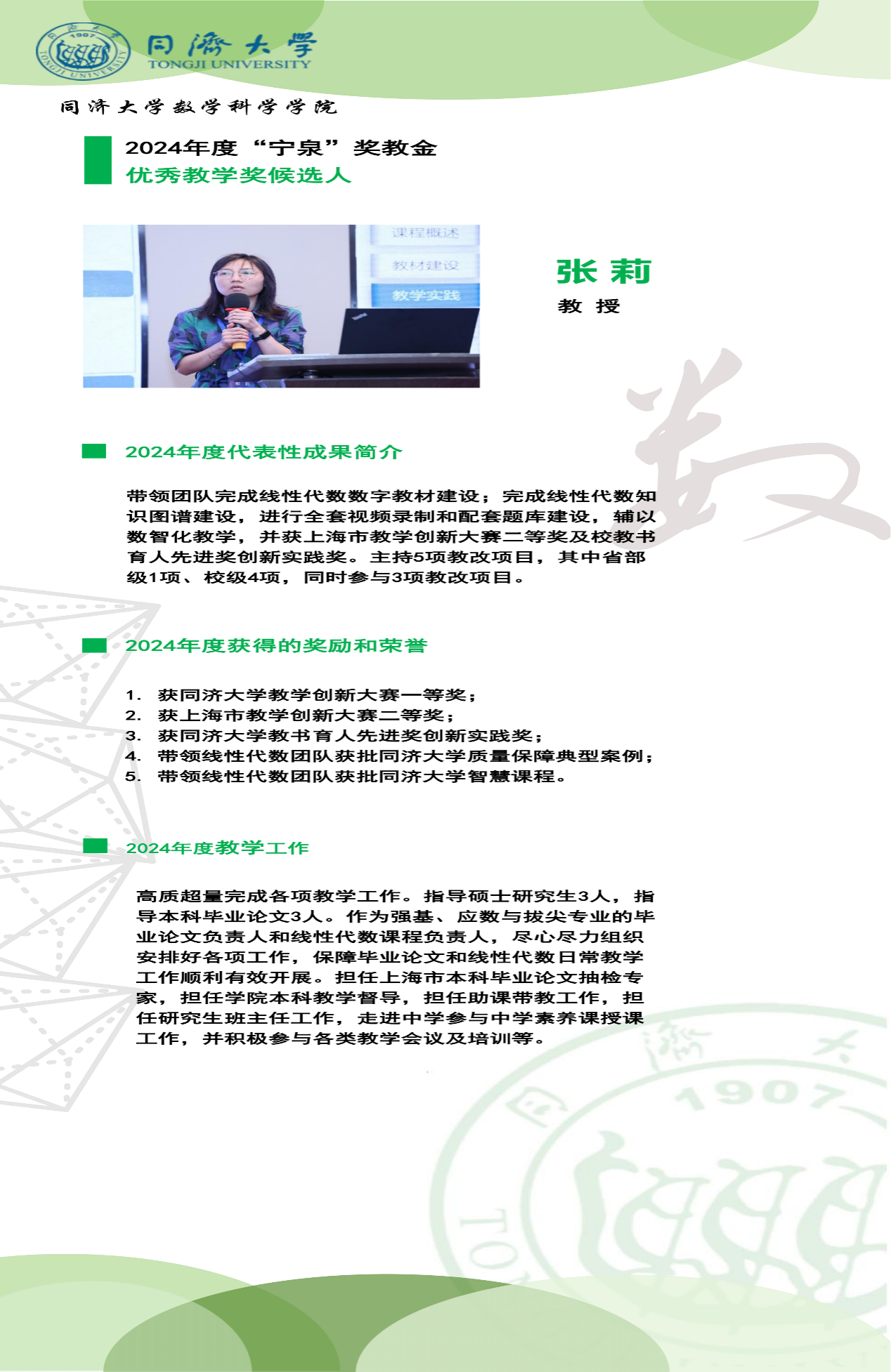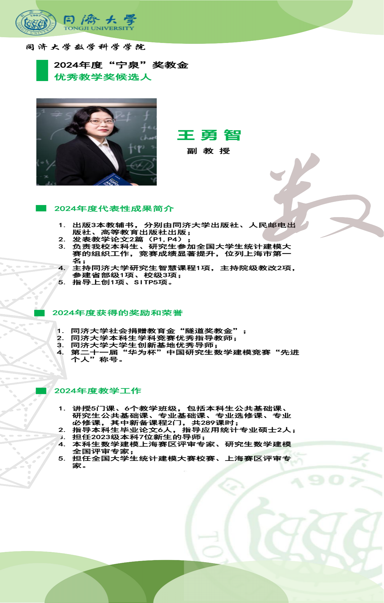 “宁泉”奖教金学院优秀奖获奖人员简介】