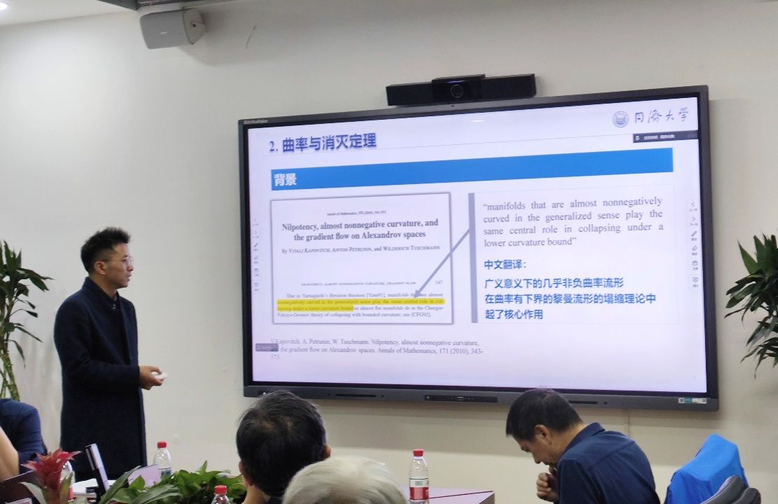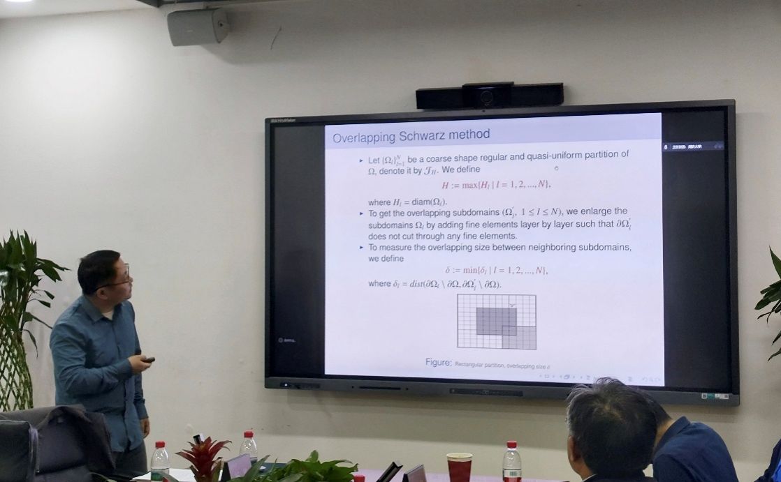 的陈小杨和梁启刚、以及来自电子与信息工程学院的衣鹏,分别以《流形上的曲率与拓扑的两个问题》《H(curl,Ω)空间的重叠型Schwarz方法》《不确定信息下的智能集群博弈计算方法与应用》为题进行了近期的科研成果报告。会议在活跃的学术氛围中圆满结束。