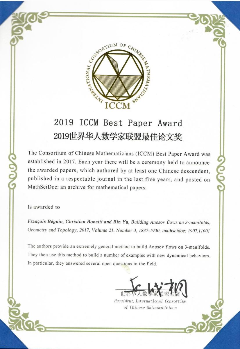 近日,我院青年教师余斌与两位法国数学家合作的近百页学术论文Building Anosov flows on 3-manifolds荣获2019年国际华人数学家联盟颁发的ICCM最佳论文奖(2019 ICCM Best Paper Award);苏育才、芮和兵、陈小杨、郑恺等获得最佳论文奖(若琳奖)。