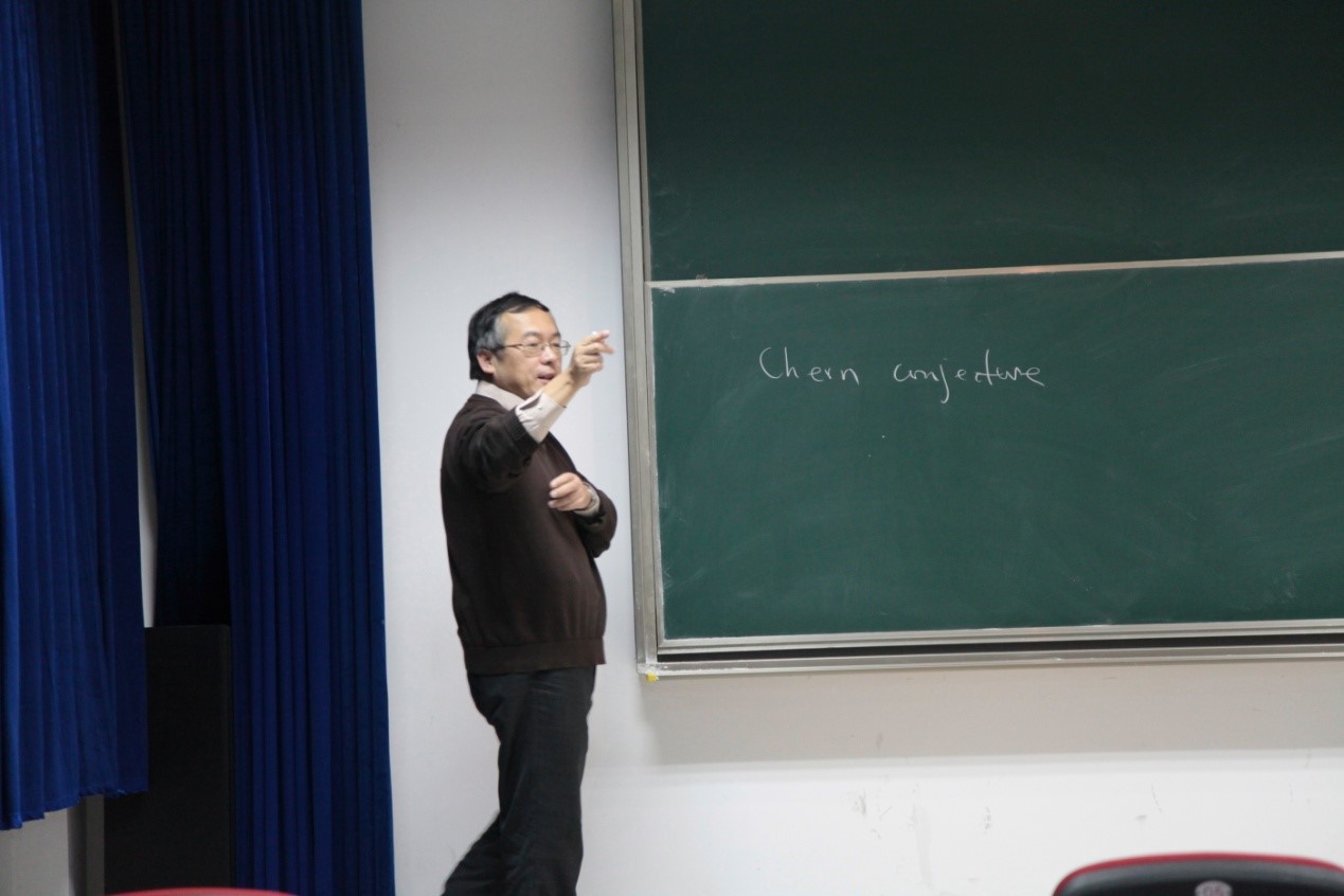 院长许学军教授主持,内容包含对Euler示性数、Gauss-Bonnet- Chern公式的介绍,以及张伟平院士关于“仿射流形Euler示性数为零”的“陈省身猜想”的最新研究成果。