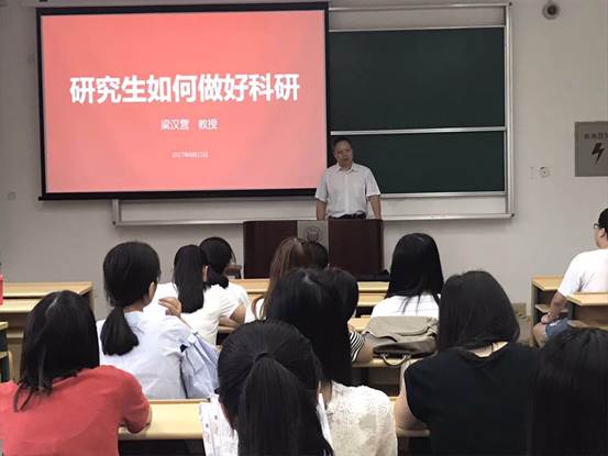 15日,我院分管研究生教学工作的梁汉营教授为全体研究生新生上了一节题为“研究生如何做好科研”的新生课。他建议大家尽快完成从本科生到研究生的角色转变,牢记学术与科研不分家,不断培养自己的独立科研能力。