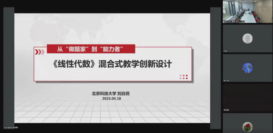 北京科技大学数理学院刘白羽教授做了题为“《线性代数》混合式教学创新设计”的报告,讲述了她和团队为解决教学痛点问题,开展混合式教学,优化课堂设计,创新教学设计路径,改革考核方式的具体做法,以及相应教材、案例库、慕课、几何直观素材库、题库和公众号六大资源建设情况,并以实对称矩阵对角化为例,详解了“六步闭环”课堂教学设计模式,使学生从“做题家”向“能力者”迈进。