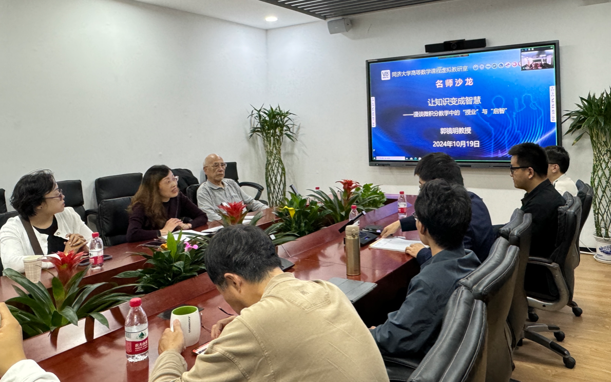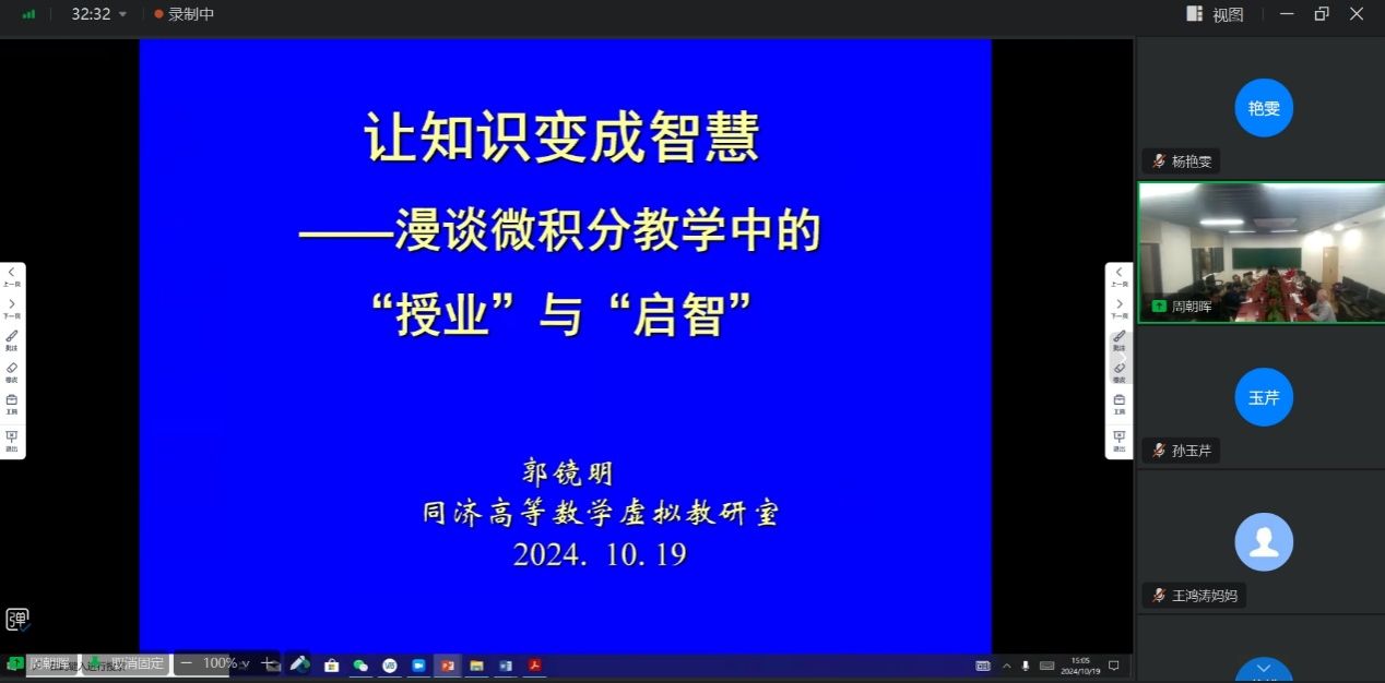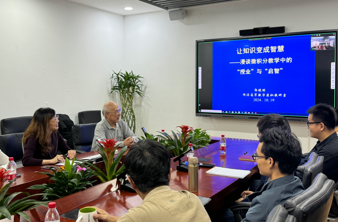 和西交利物浦大学郭镜明教授作主题报告,报告题目为“让知识变成智慧一一漫谈微积分教学中的‘授业’与‘启智’”。本次教研活动依托虚拟教研室平台,采用线上线下同步开展的形式,由虚拟教研室负责人周朝晖教授主持,a漫