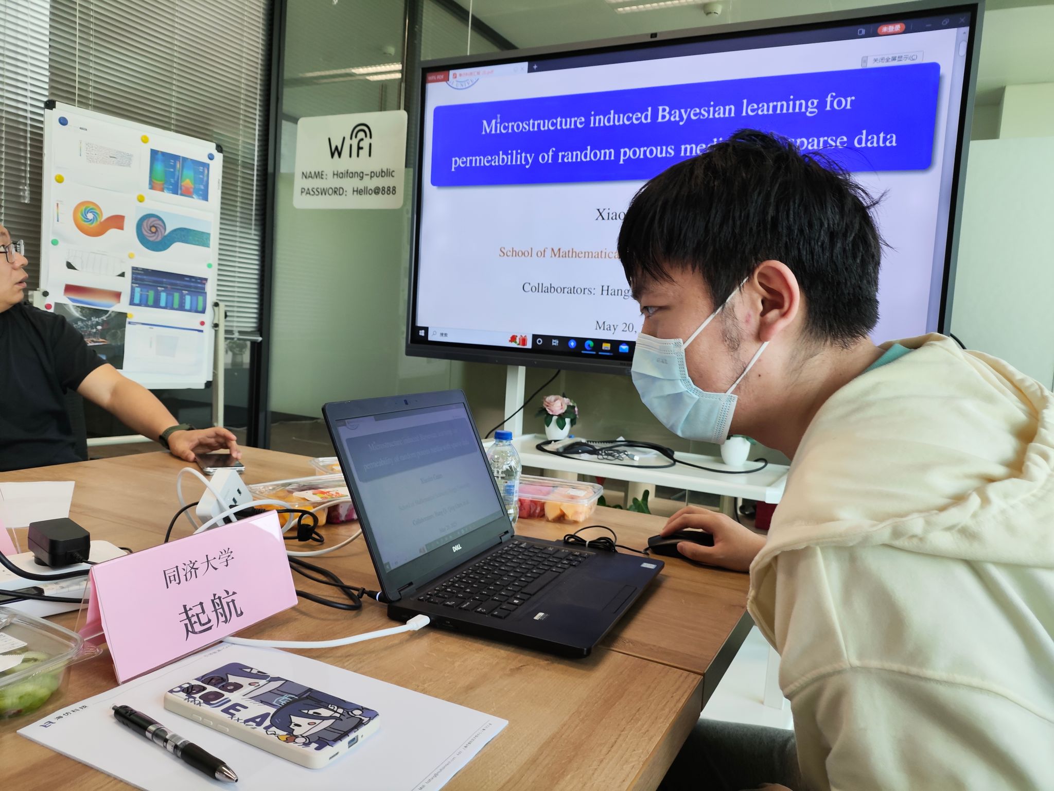 起航同志就“基于稀疏数据贝叶斯学习的随机多孔介质渗透率快速预测”这一主题进行了分享。他深入浅出地介绍了自己的科研工作,包括材料微结构设计的应用背景、贝叶斯学习的数学原理以及未来模型的优化改进。并指出稀疏贝叶斯学习框架在数学理论和应用研究领域展现出深厚的学术潜力,为“结构-性能-优化设计”提供了一个高效且高精度的计算框架。