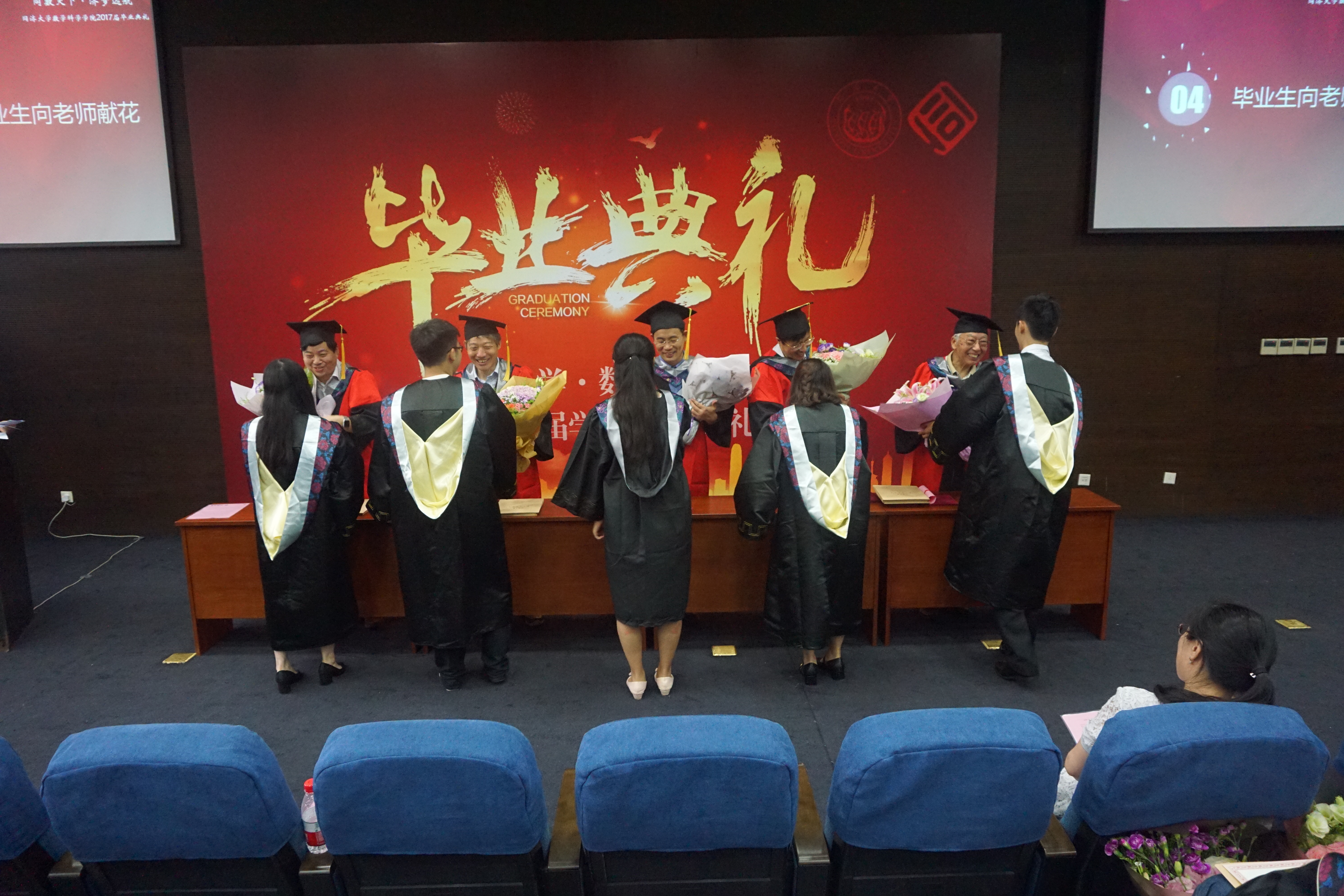 随后,身着学位服的全体毕业生依次来到主席台前,学院领导、教授代表为毕业生颁发学位证书,并为他们拨穗。拨穗正冠礼结束后,毕业生代表向老师们深鞠一躬,献上鲜花,感谢老师在校期间的悉心指导和无私关怀。