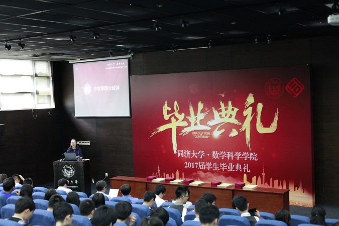 毕业典礼在回忆往昔的开场视频中拉开帷幕。许学军院长代表学院致辞,他向圆满完成学业的2017届毕业生表示诚挚祝贺,并希望同学们走向社会后仍能牢记三心:永葆恒心脚踏实地,不因挫折失败丧气;勿忘初心坚持梦想,不被眼前名利驱使;充满信心挑战自我,不以物喜不以己悲。最后,许院长希望同学们能在各个行业、各个岗位上有所作为,成为对社会有用的同济数学人。