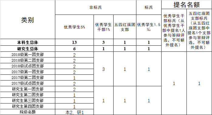 优秀学生”根据名额分配,支部名额以团支部为单位进行评选、院级名额由学院评审委员会评出,优秀学生(标兵)、优秀学生干部、五四红旗团支部由学院评审委员会评出。